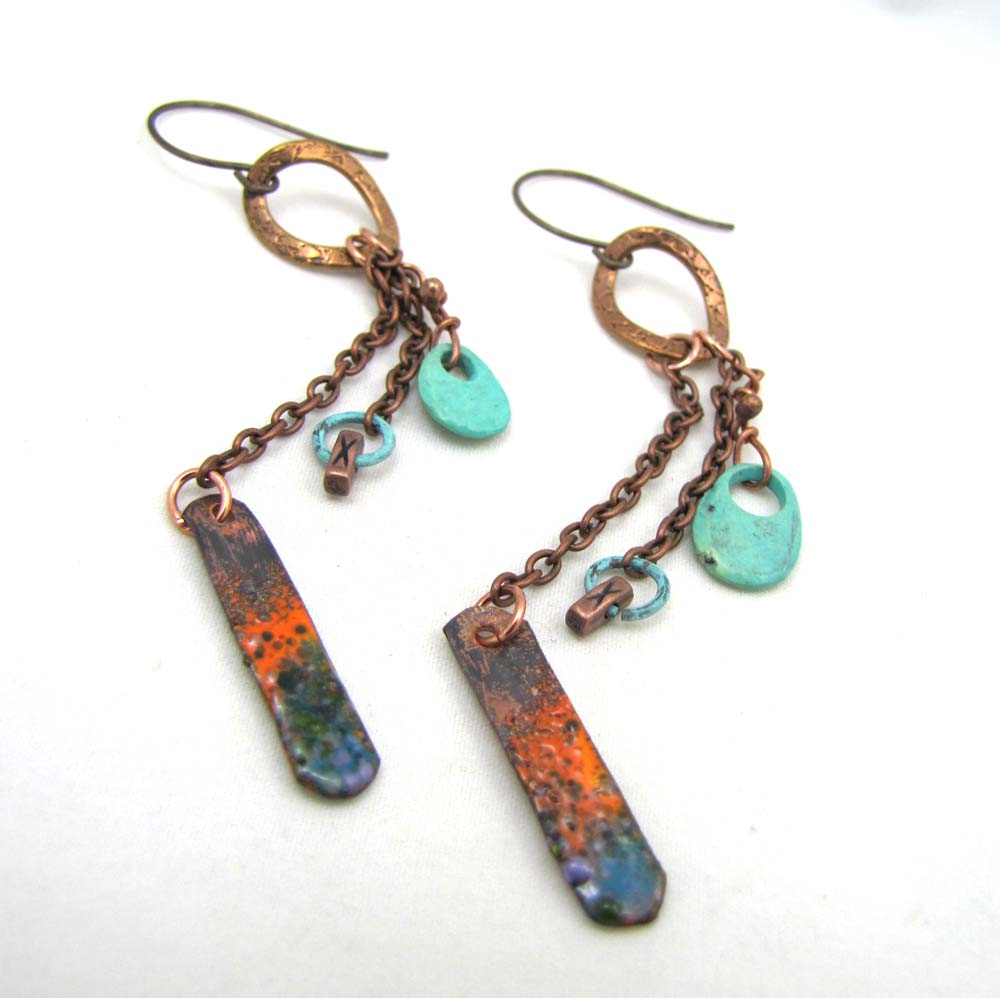 torch fired enamel - the only reason the twisted rings are wired is that I can't figure how to keep the jump rings closed. I think the wire works as a design element as a result ...so cool on that